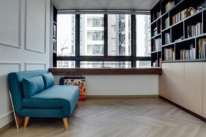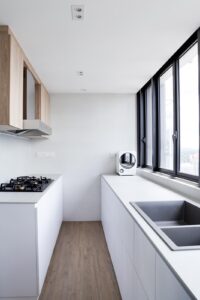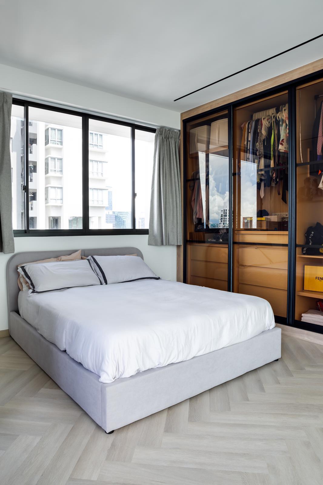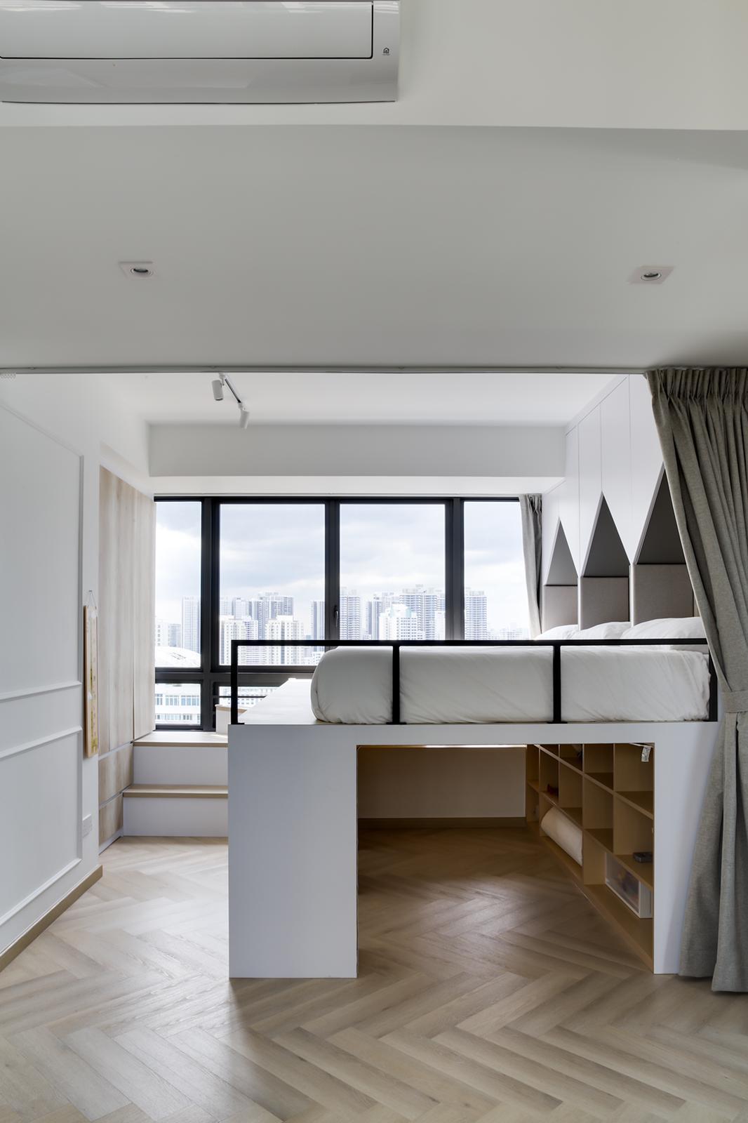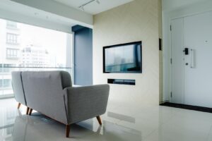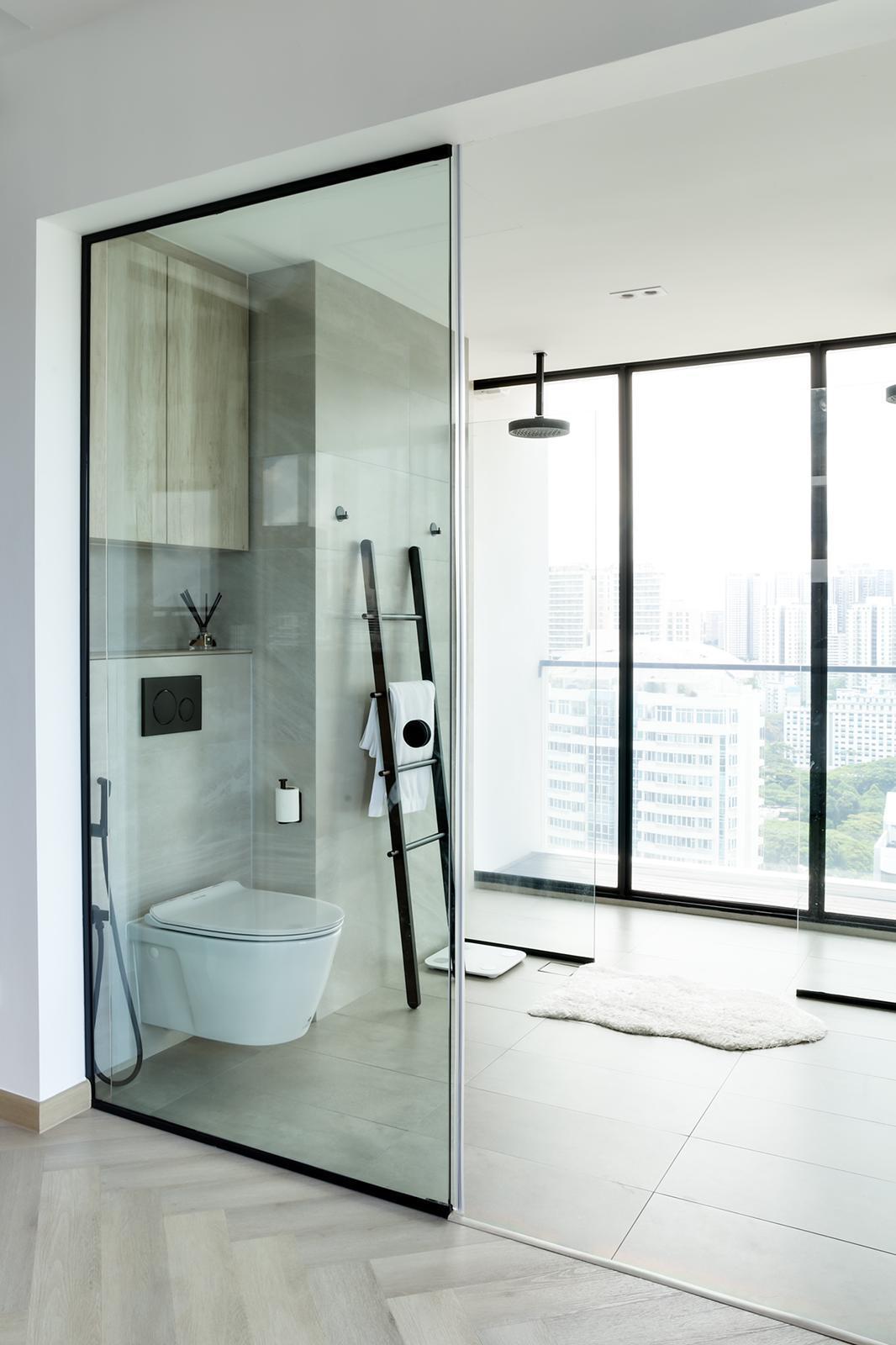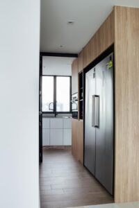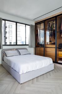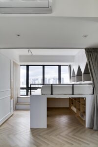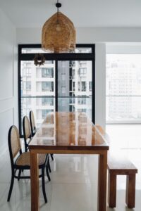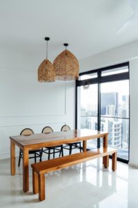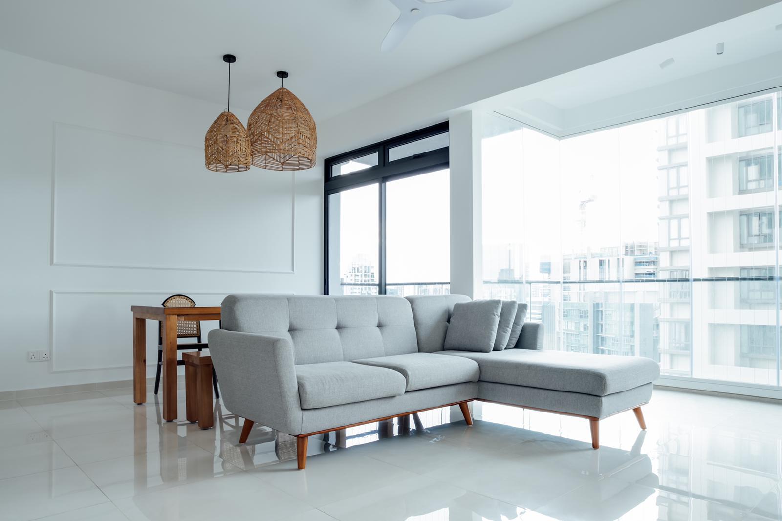 Designed with a refined approach to modern minimalism, this condo space embraces natural light, clean lines, and organic textures. The neutral palette enhances the airy atmosphere, while the plush grey sofa and warm wooden dining set create a cozy contrast. Rattan pendant lights add a touch of artisanal charm, balancing functionality with aesthetics. This inviting home is a perfect blend of simplicity and sophistication, offering a serene retreat in the heart of the city.