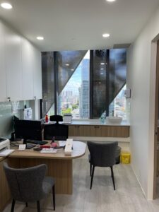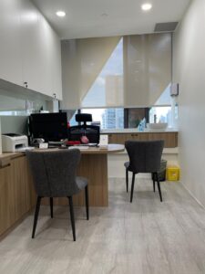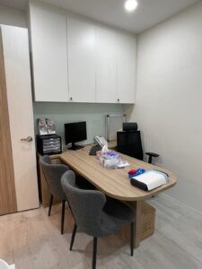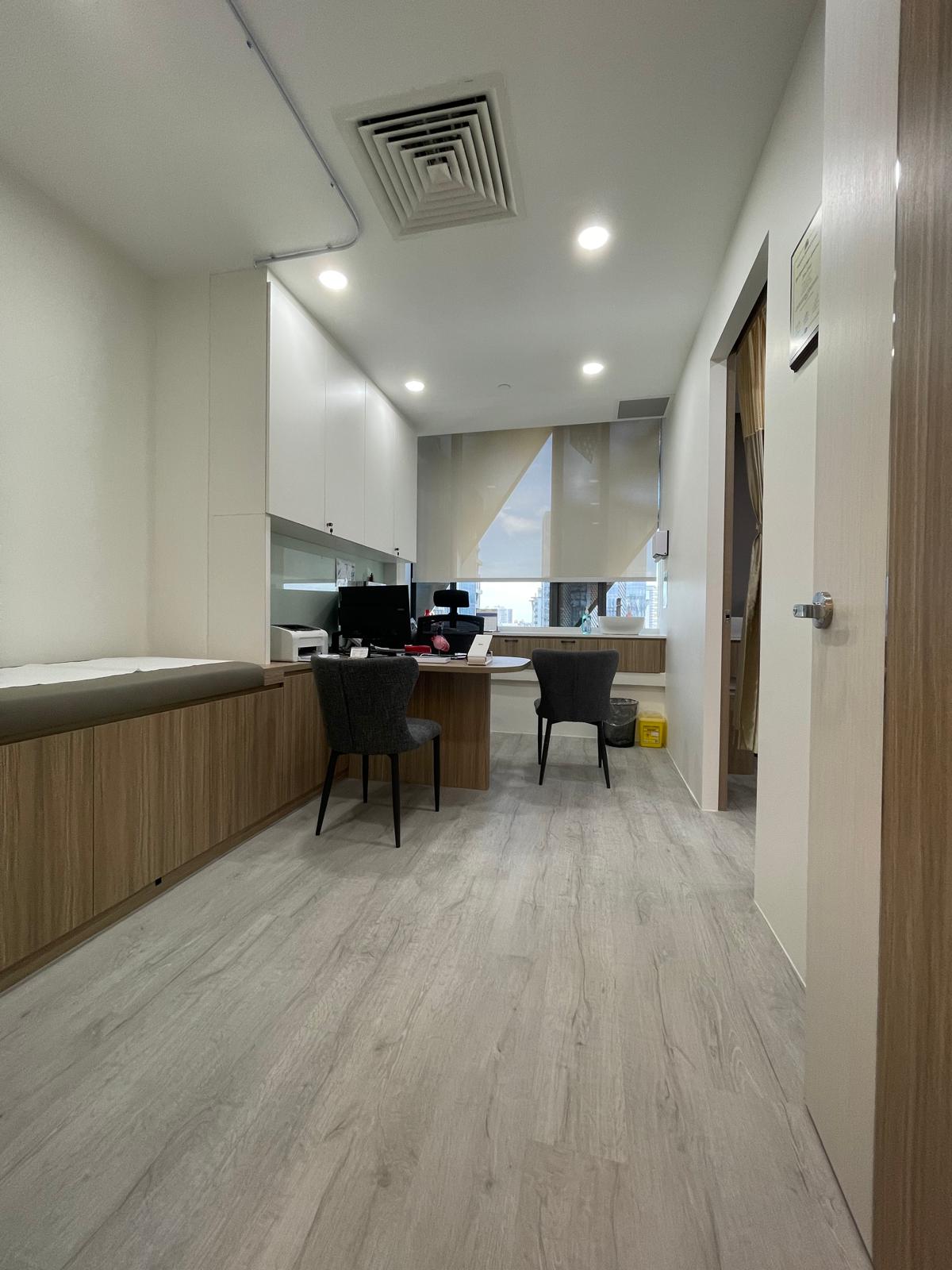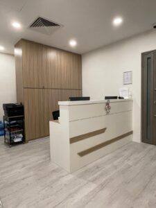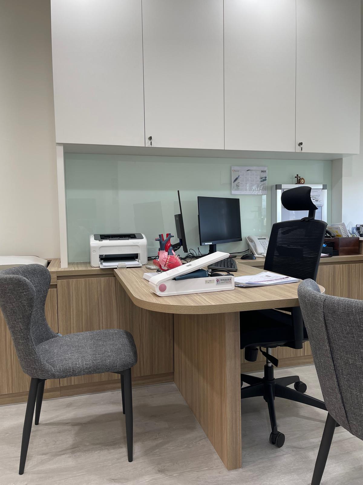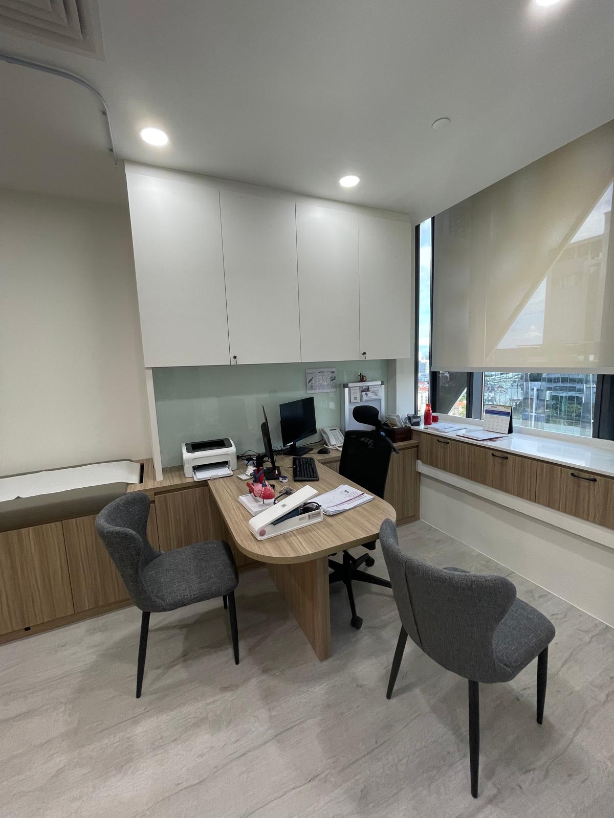 Designed for efficiency and comfort, this clinic features a clean, minimalist aesthetic with warm wood accents and neutral tones. The sleek reception desk, paired with ample storage solutions, creates an organized and welcoming atmosphere. Soft lighting enhances the sense of calm, ensuring a reassuring environment for patients. Functional, modern, and thoughtfully designed, this space prioritizes both professionalism and patient comfort.