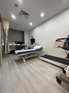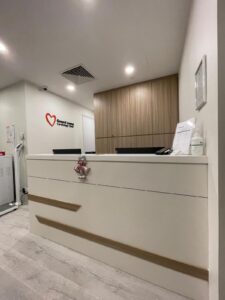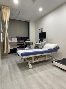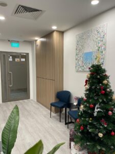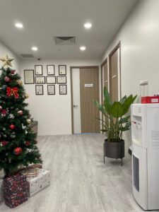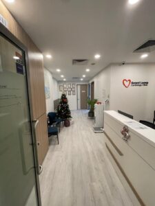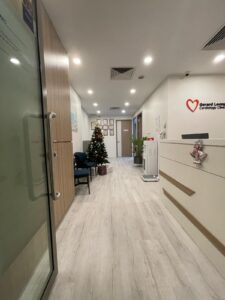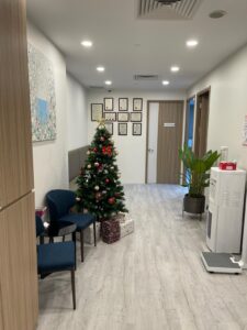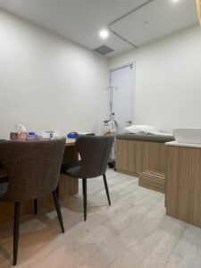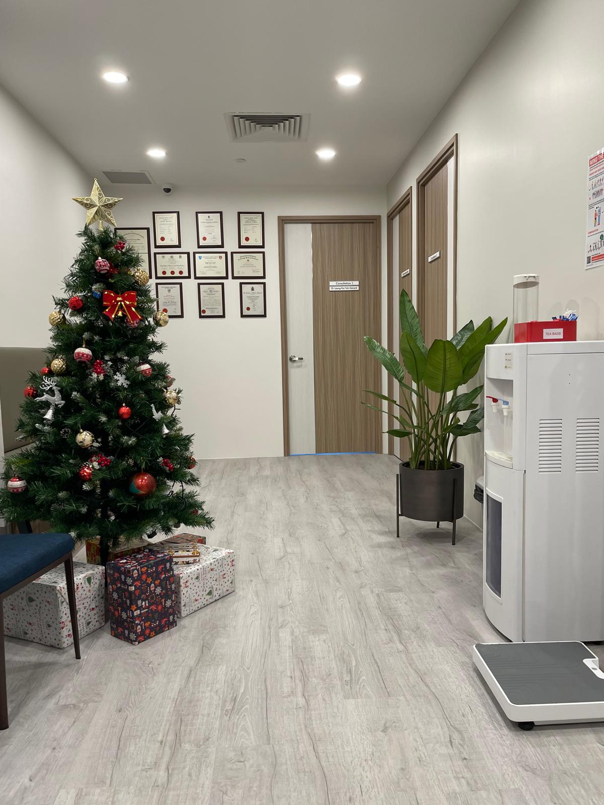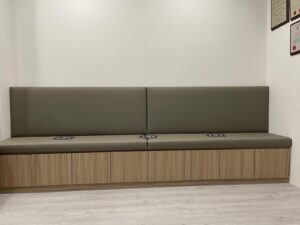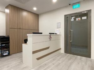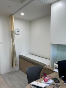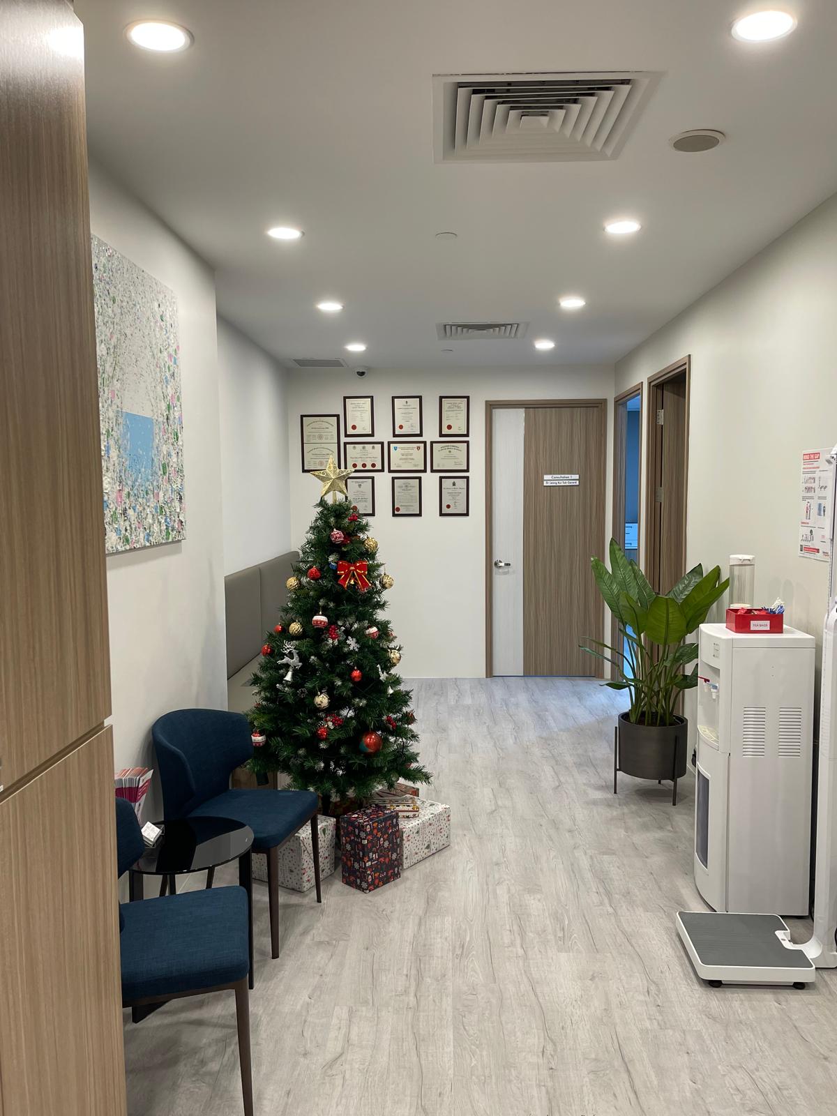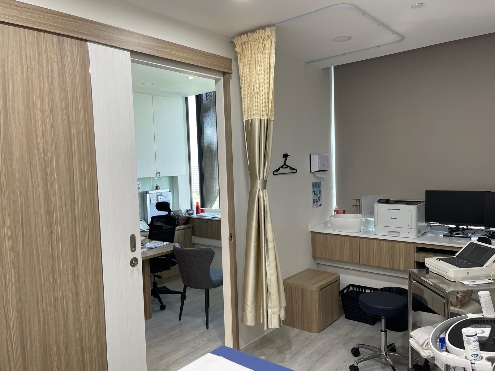 Designed for efficiency and comfort, this clinic features a clean, minimalist aesthetic with warm wood accents and neutral tones. The sleek reception desk, paired with ample storage solutions, creates an organized and welcoming atmosphere. Soft lighting enhances the sense of calm, ensuring a reassuring environment for patients. Functional, modern, and thoughtfully designed, this space prioritizes both professionalism and patient comfort.