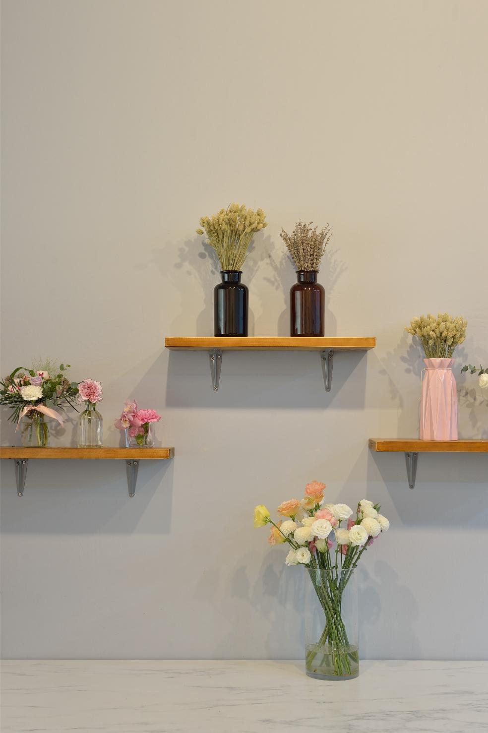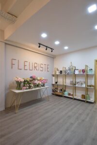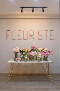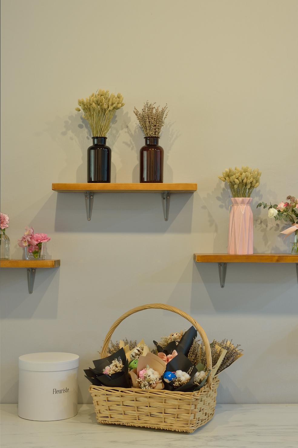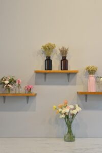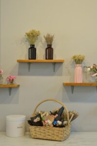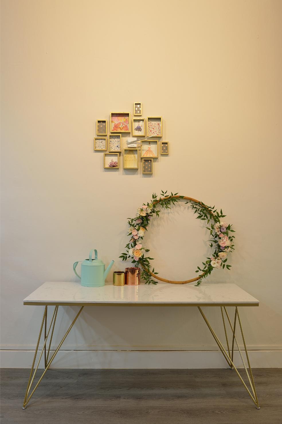 This beautifully curated space blends modern minimalism with soft, feminine charm. A neutral color palette, accented by warm lighting and gold details, creates an inviting and sophisticated atmosphere. Thoughtful shelving displays, delicate floral arrangements, and artistic decor add a touch of whimsy while maintaining a clean, organized aesthetic. Functional yet stylish, this interior is designed to inspire creativity and offer a welcoming ambiance.