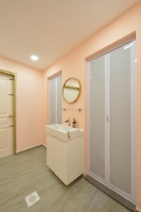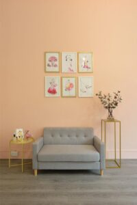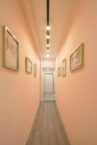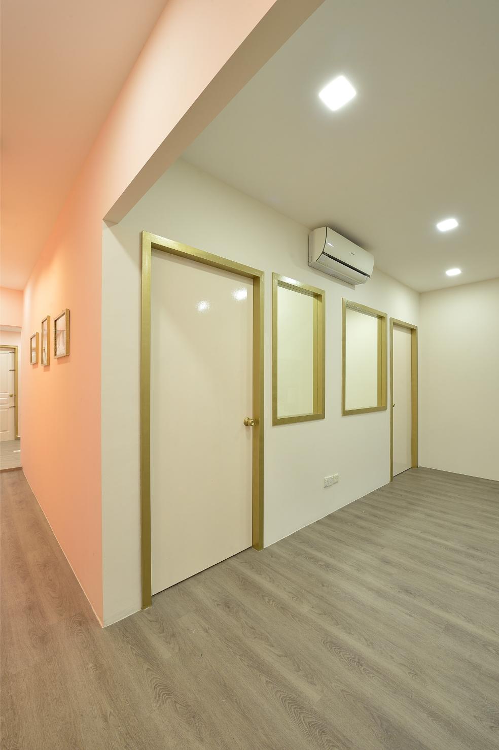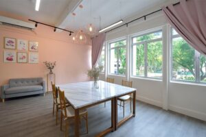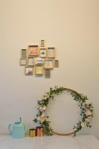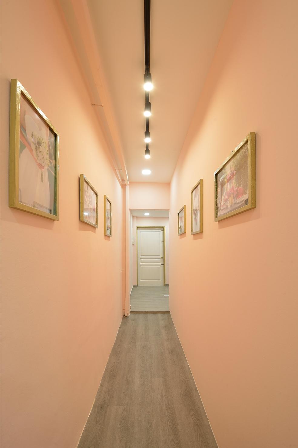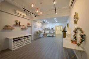 This beautifully curated space blends modern minimalism with soft, feminine charm. A neutral color palette, accented by warm lighting and gold details, creates an inviting and sophisticated atmosphere. Thoughtful shelving displays, delicate floral arrangements, and artistic decor add a touch of whimsy while maintaining a clean, organized aesthetic. Functional yet stylish, this interior is designed to inspire creativity and offer a welcoming ambiance.