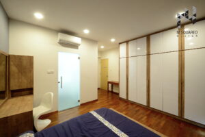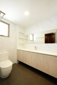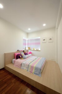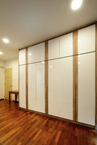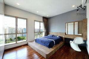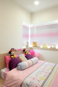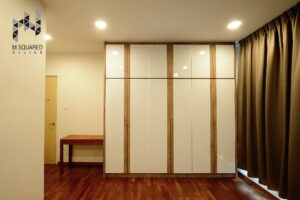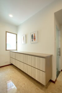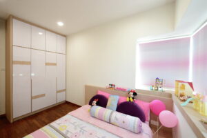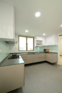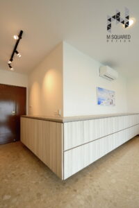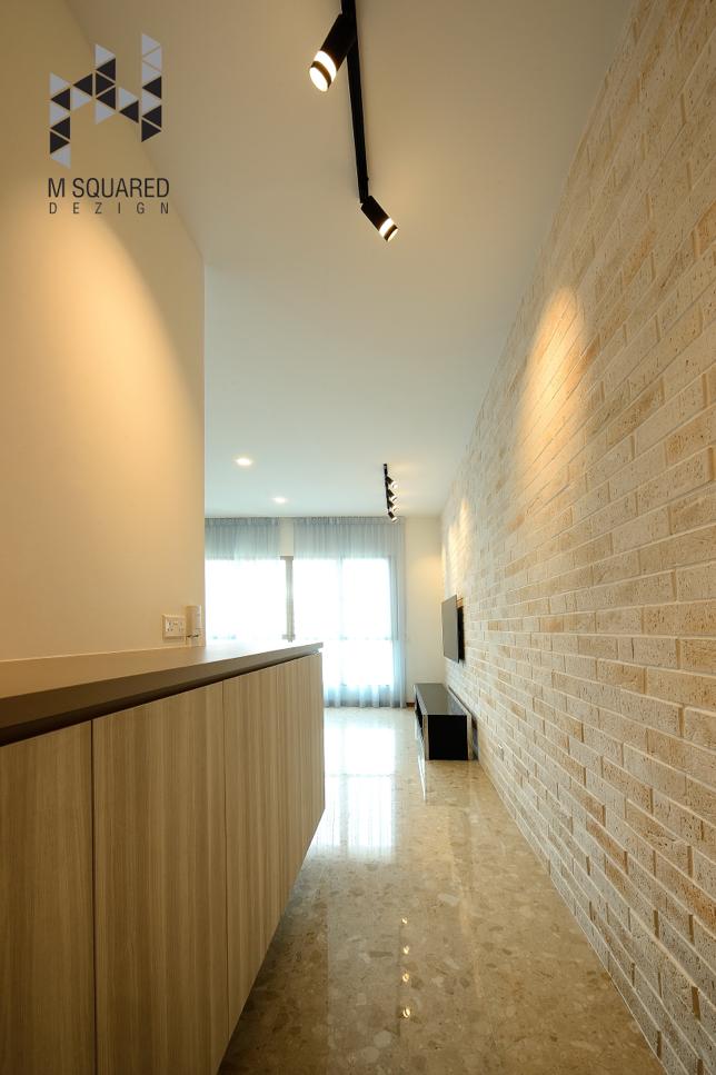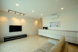 This modern condo embodies simplicity and elegance with a clean, open-concept design. The neutral color palette, textured brick accent wall, and sleek built-in cabinetry create a sense of space and sophistication. Soft ambient lighting enhances the cozy yet airy atmosphere, making the living area feel warm and inviting. Thoughtfully placed décor and furniture contribute to a clutter-free, functional space, perfect for contemporary urban living.
